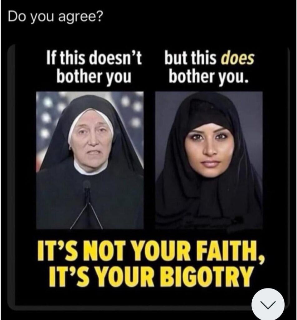 Il velo islamico viene spesso definito simbolo di sottomissione femminile, mentre l’abito da suora – molto simile in apparenza – è visto come segno di purezza e devozione.